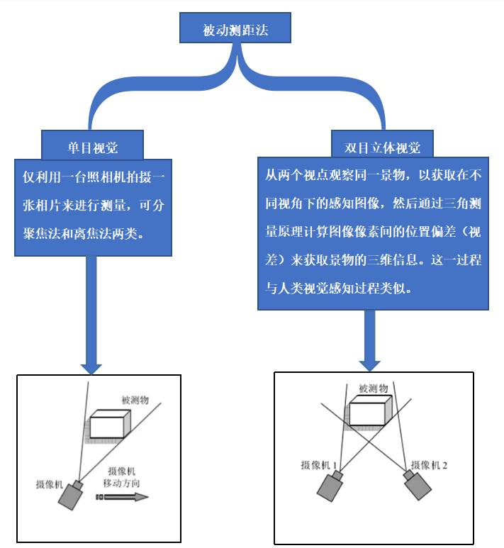 被動測距:輻射源設(shè)置不需要人主動去設(shè)置,它是通過自然光照下的二維圖像來重建景物的三維信息,它的特點:成本低、實現(xiàn)方式比較靈活、有較強的適應(yīng)性。