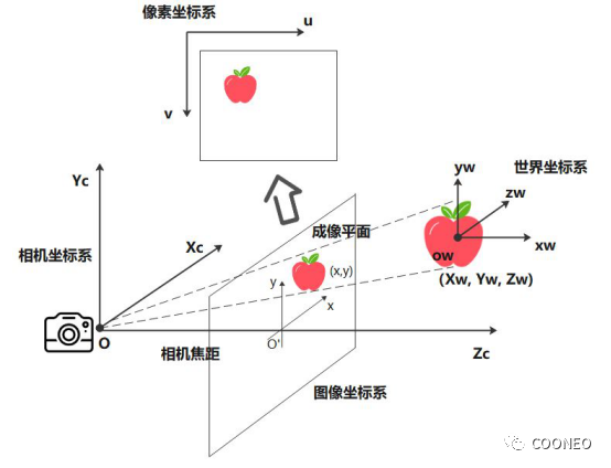 3、相機坐標(biāo)系(Xc,Yc,Zc):相機光心點為O,X軸和Y軸與圖像平面坐標(biāo)系的x軸和y軸平行,Z軸為相機的光軸,和成像平面垂直。光軸與圖像平面的交點為圖像主點O',由點O與軸組成的直角坐標(biāo)系稱為相機坐標(biāo)系。OO'為相機焦距。