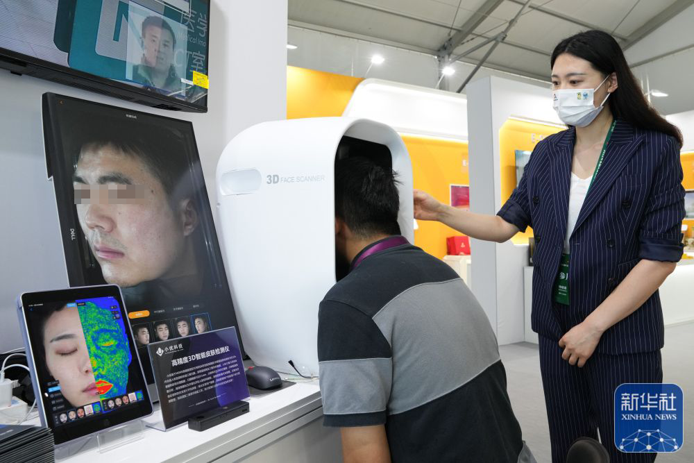 在活動(dòng)現(xiàn)場(chǎng)人民網(wǎng)記者(趙越、王銳)對(duì)小優(yōu)智能科技商務(wù)總監(jiān)韓曉菲進(jìn)行現(xiàn)場(chǎng)采訪,并現(xiàn)場(chǎng)體驗(yàn)了小優(yōu)智能科技高精度3D人臉皮膚檢測(cè)儀。