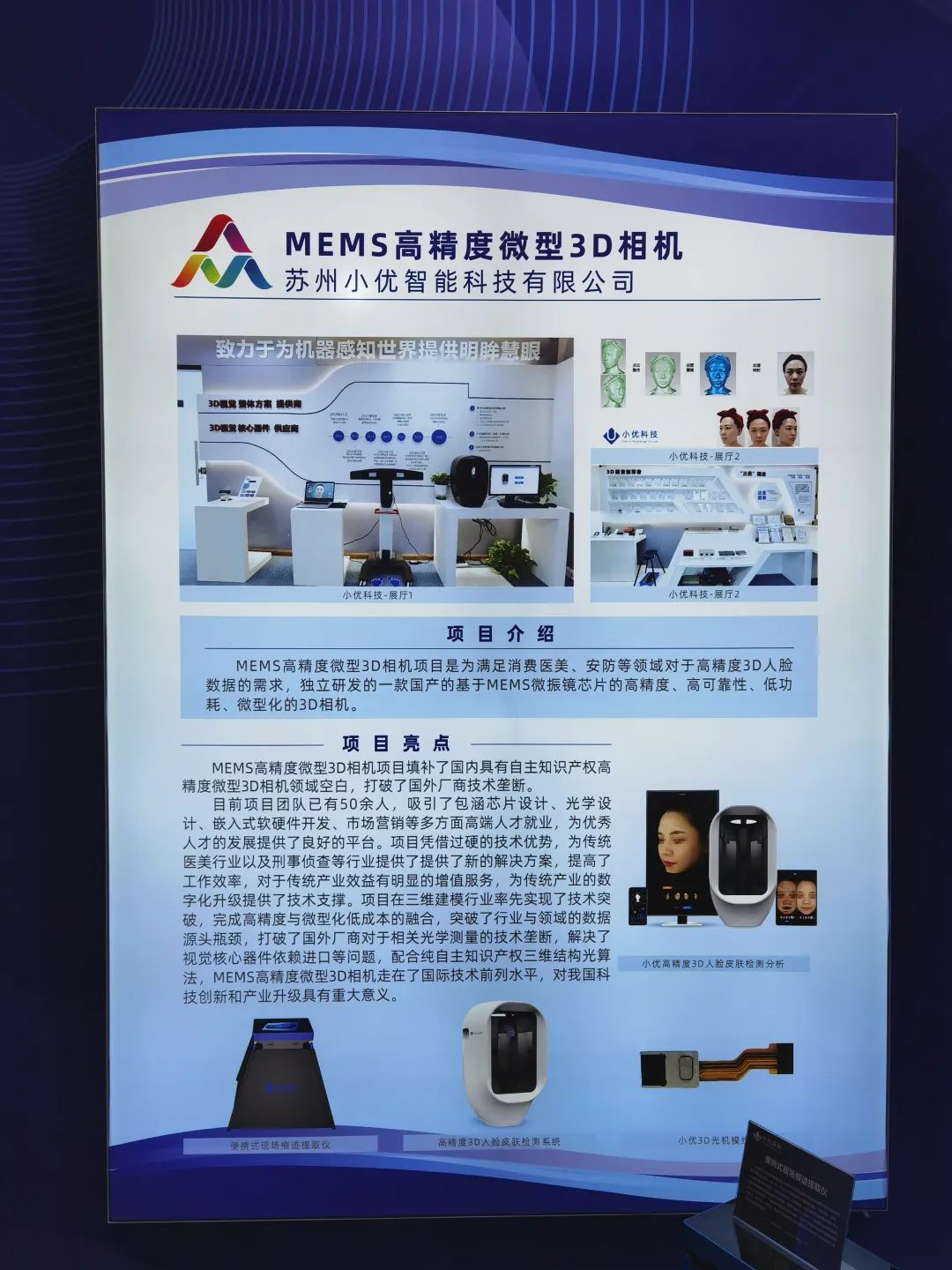 小優(yōu)智能科技攜自主研發(fā)的MEMS振鏡芯片、3D光機(jī)模組、MEMS高精度微型3D相機(jī)、高精度3D人臉檢測(cè)系統(tǒng)、便攜式現(xiàn)場(chǎng)痕跡提取儀等產(chǎn)品參展。并在展會(huì)活動(dòng)現(xiàn)場(chǎng)向各級(jí)領(lǐng)導(dǎo)、來(lái)展人員詳細(xì)介紹了公司發(fā)展歷程、最新研發(fā)的高精度3D相機(jī)產(chǎn)品優(yōu)勢(shì),并進(jìn)行了高精度3D人臉檢測(cè)效果演示。